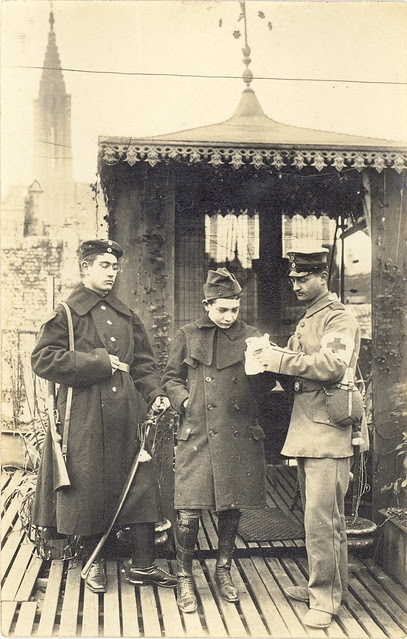 WWI German Medic and Armed German SentryAn armed German sentry looks sternly on as a German medic examines the papers of a young boy. This photograph is one of a set of three WWI photos taken at the same location in either Strassburg, Germany or somewhere in German-occupied Belgium. The photographer's stamp on the back reads, "Photogr. Dober, Strassburg, Dornengasse 4." However, the person who sold me this photograph believes that the boy's cap might be Belgian military and that a German photographer took the picture in Belgium and later developed it in his studio in Strassburg. The boy is wearing military-like leather leggings, and it is not know if he is an actual member of the military or perhaps a cadet at a military school. [NOTE: ART NAHPRO has solved the mystery as to the location. It is Strassburg. The sentry to the left is not only armed with a sword and wearing spurs, he is also armed with what appears to me might be a shotgun. This would seem to be a strange weapon for a soldier in the Imperial German Army to be carrying, but perhaps it was for riots or crowd control in close quarters. In another picture in this set of three photos, this soldier has taken off his overcoat, and the emblem on his epaulette reveals him to be a member of the German 84th Foot Artillery. The shoulder strap of the Medic on the right indicates that he is assigned to the German 16th Infantry. The medic wears the distinctive red cross armband and is carrying a canteen. The other picture of the medic reveals that he is armed with a holstered pistol on his right side, but it is not visible in this photograph because of the way he is turned. On yet another photograph of this Medic, he is identified as "Karl Rich" on the back of the picture. If this is a guard shack, it certainly is a fancy one. It is embellished with a decorative metal border at the edge of the roof and is topped by a delicate spire adorned with what appear to be metal flowers on wire stems. A pair of graceful planters flank the doorway, and vines from the planters grow up the sides and festoon the top of the doorway. Inside the structure, two graceful rattan chairs and a table can be seen. There is a mat on the floor. Perhaps this is not really a guard shack, but is instead a scenic observation structure from which the city can be viewed. All in all, this is a fascinating set of three WWI photographs, which poses a many, many interesting questions to which we may never know the answers.